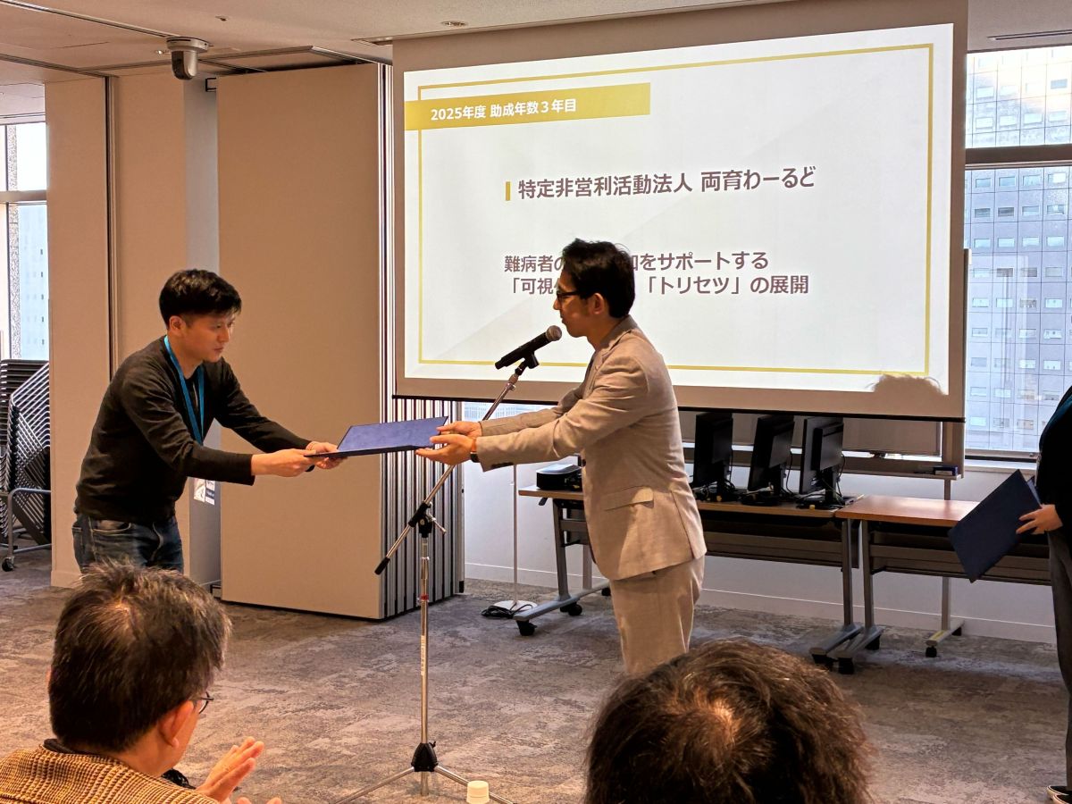 私たちNPO法人両育わーるど は、この度、「ファイザープログラム~心とからだのヘルスケアに関する市民活動・市民研究支援」の2025年度の助成13プロジェクト・団体に選出されて、12月15日の授賞式に参加し、理事長の重光が発表を行いました。各プロジェクトの発表後には、他団体との交流会が開かれ、貴重な学びの機会となりました。