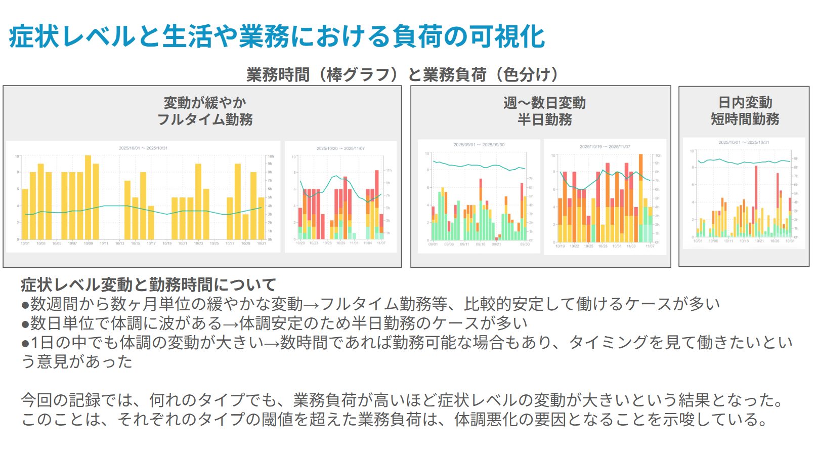 近藤は当事者として、難病者の日常の困難や働き方などについて話をしました。開発中のRDコンパスについても、トライアル結果をもとに、RDワーカーが働きやすい環境を作るためには、職場でのコミュニケーションが重要であること、当事者本人の同意のもと「自分のトリセツ」の作成や「症状の変動」の可視化をすることで、周囲の人とのコミュニケーションを円滑にすることが可能であることを説明しました。また、円滑なコミュニケーションには、心理的安全性の確保が不可欠であり、キャリア支援者の力が必要であることを伝えました。