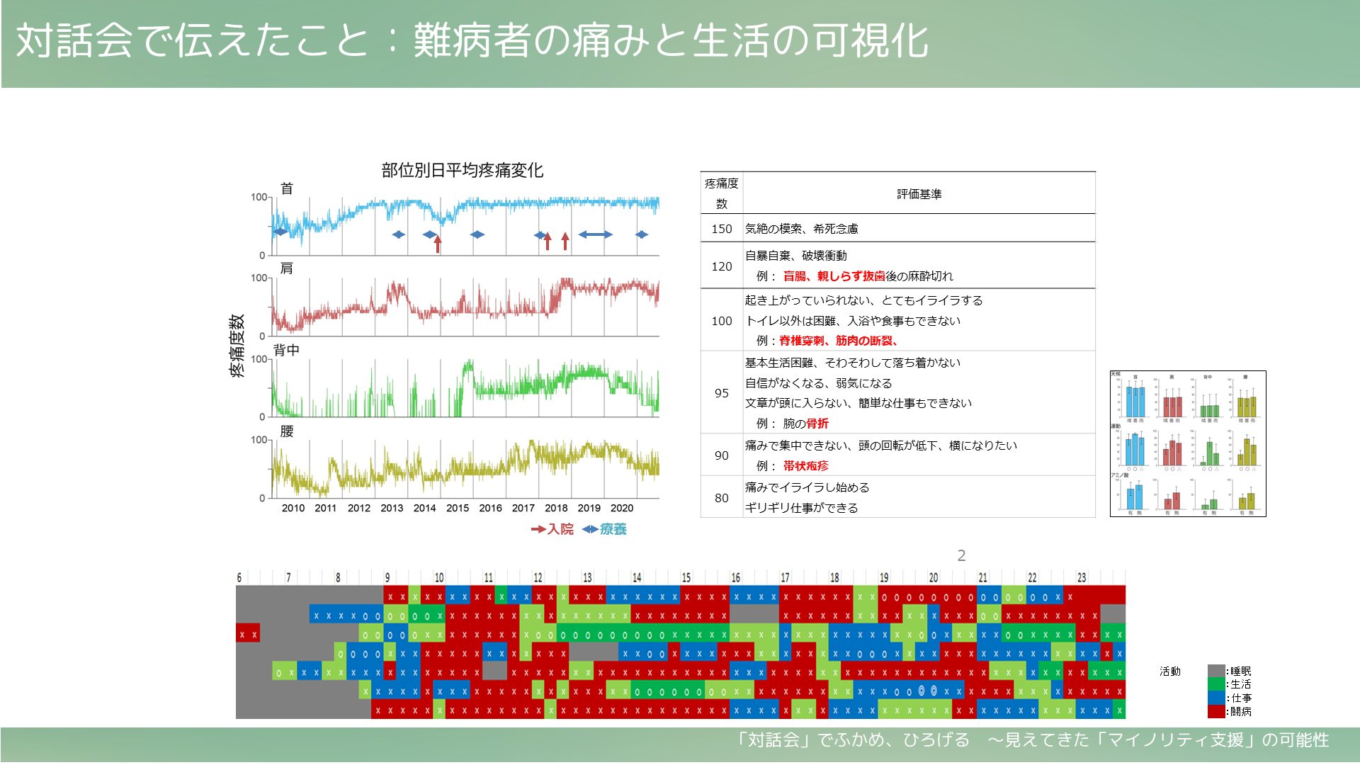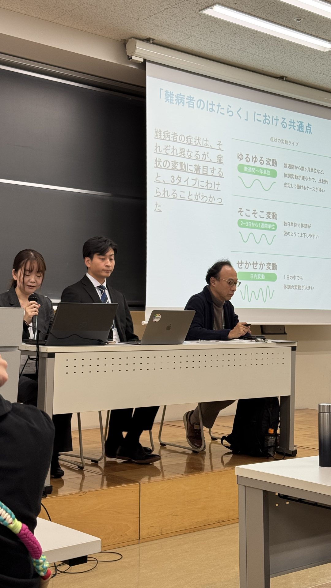 重光からは、難病でも働きたい・働ける・働いているRDワーカーや、症状変動をふまえた3つのタイプ(ゆるゆる・そこそこ・せかせか)について改めて紹介し、キャリア支援者に向けて、「制度の狭間にいる難病者の就労こそ、キャリア支援者の出番で、腕の見せどころ」、「難病者の就労支援は、本人も支援機関も雇用側も皆手探りなので、これまでキャリア支援で難病者に関わったことが無い方もまずは気軽な一歩を。そして一緒にRDワーカーの活躍の機会を増やしていきましょう」というメッセージを伝えました。